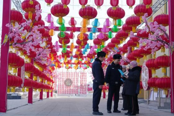 民警李洪龙(左二)在马旭文博艺术中心门口服务游客