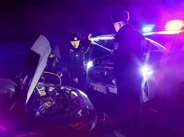 2月22日21时许,双井派出所巡逻民警张博、王嘉骏在某公路双井路段周边开展夜间巡逻时,发现一辆白色轿车停靠在路边,车主正焦急地查看车况,民警立即停车上前询问情况。